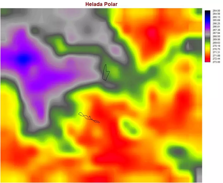 Además, se realiza un análisis de la dinámica de movimiento de aire frio durante los eventos de heladas en el predio como en los alrededores de este. Se utilizan imágenes del satélite NOAA, sensor AVHRR, las cuales son refinadas, para aumentar su precisión espacial. Cada imagen presentada, corresponde a un promedio de varias imágenes pertenecientes heladas del mismo tipo, de modo de entregar una visión del comportamiento que tiene el aire frío en días tipo, sometidos a heladas radiativas y polares.