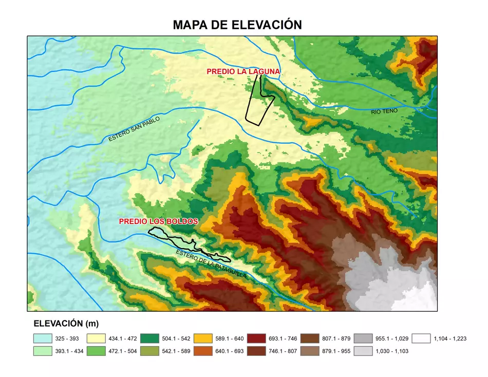 Se analiza la topografía en los alrededores del predio para determinar los efectos que ejerce el relieve local en la dinámica del movimiento de aire frio en el predio, así como la influencia de otros “driver climáticos” presentes en cada zona, tales como surgencias marinas, cuerpos de agua, relieve, latitud y otras singularidades geográficas.