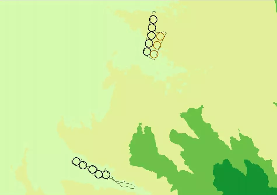 Diseño de ubicación de torres de viento para el control de heladas. Cada torre tiene un alcance de 260 metros (130 metros de radio), representada por el círculo en la imagen.
