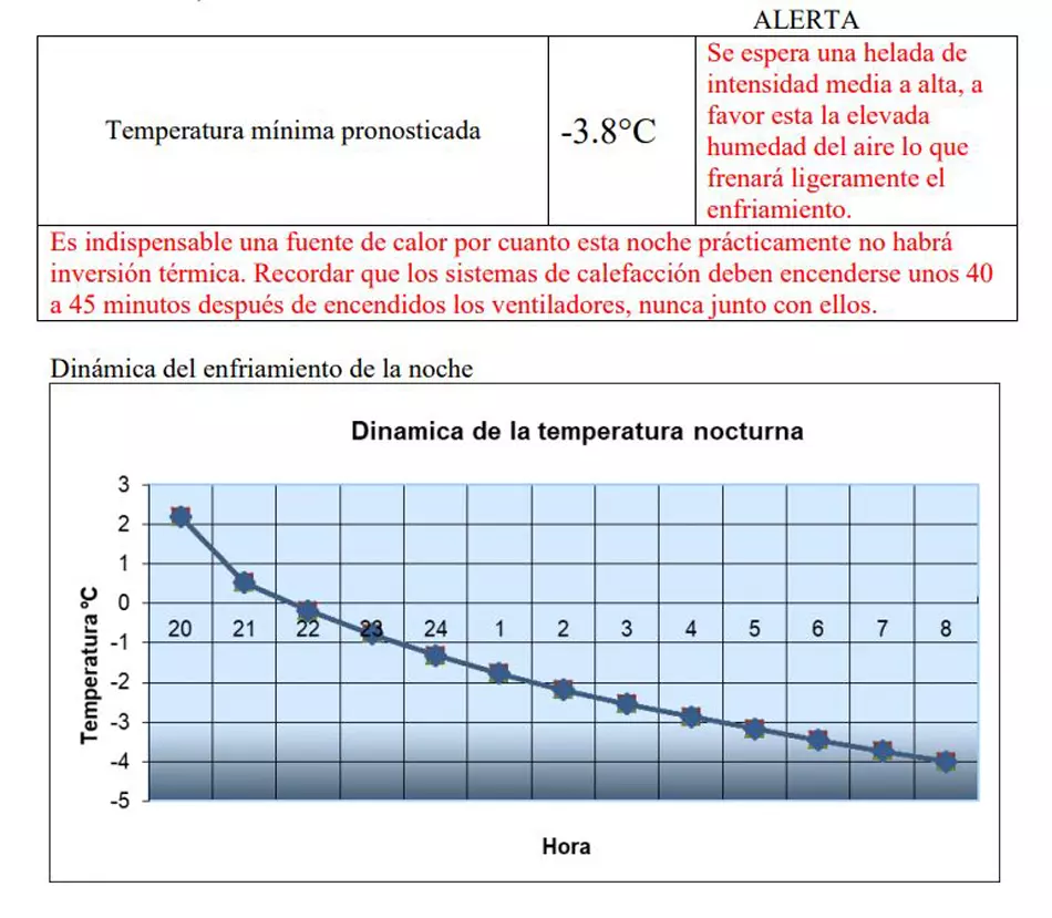 Corresponde a un sistema de pronóstico meteorológico predial. Consiste en un monitoreo diario que se realiza a partir de datos de locales de temperatura, humedad relativa y nubosidad en el predio a las 20:00 hrs. Con esta información se estima la curva de enfriamiento durante la noche, en base a modelos de pronóstico, calibrados localmente.