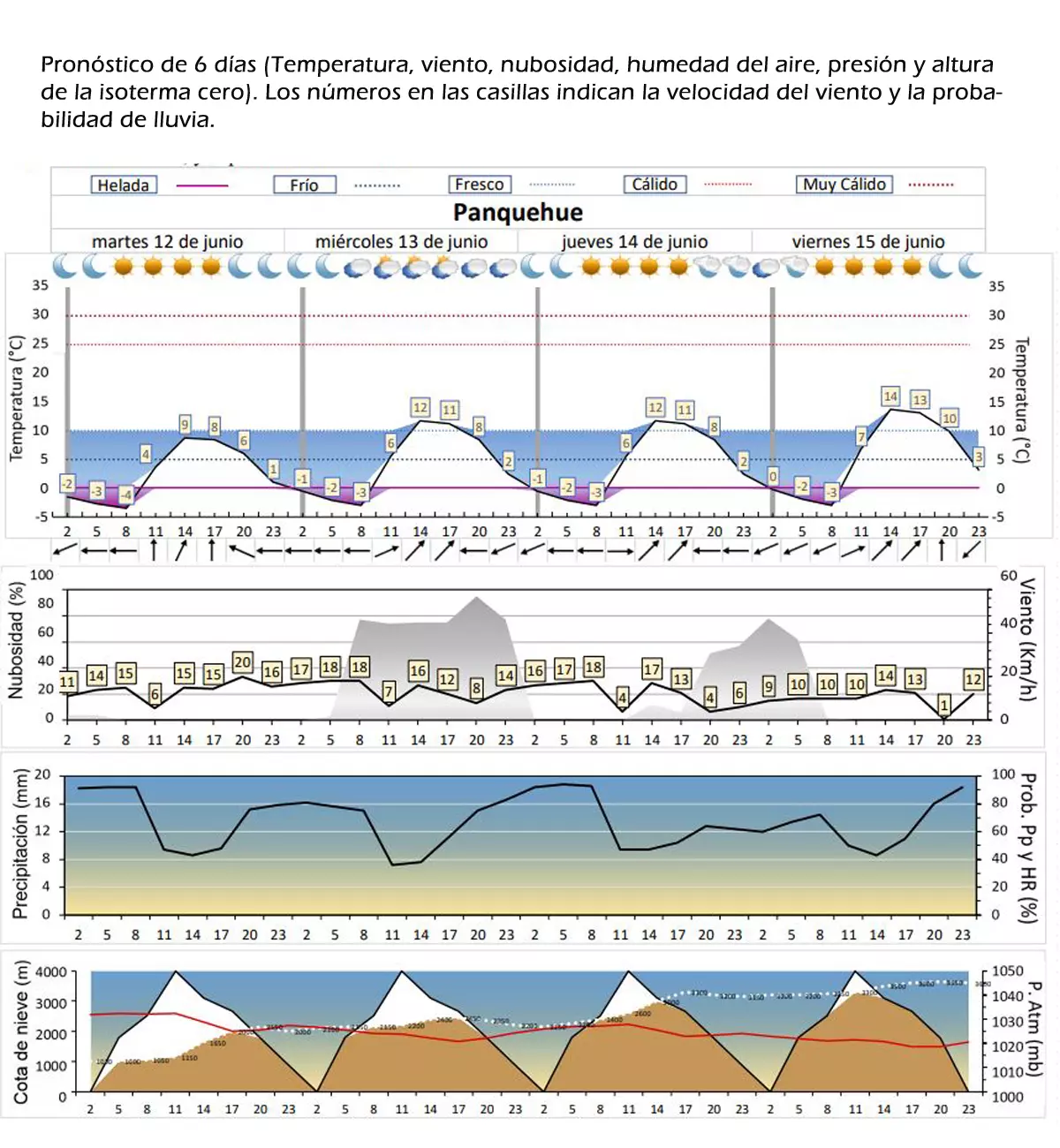 Además se genera un pronóstico para 6 días sobre eventos extremos como heladas, lluvias, viento, nubosidad, ondas de calor y frio. Esta proyección climática es construida en base a información confiable de distintos centros meteorológicos mundiales.